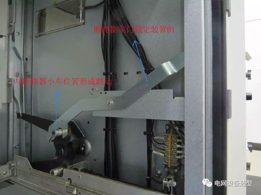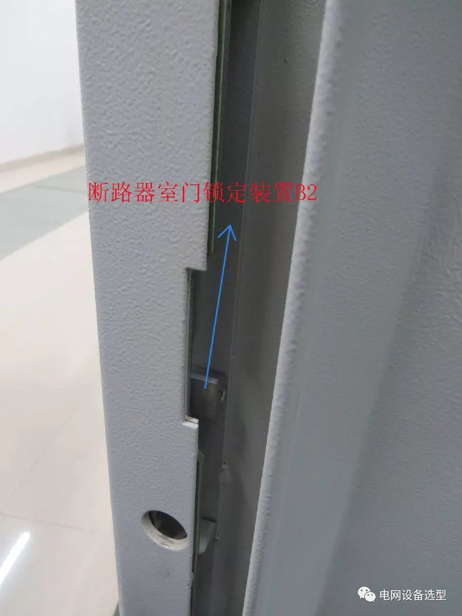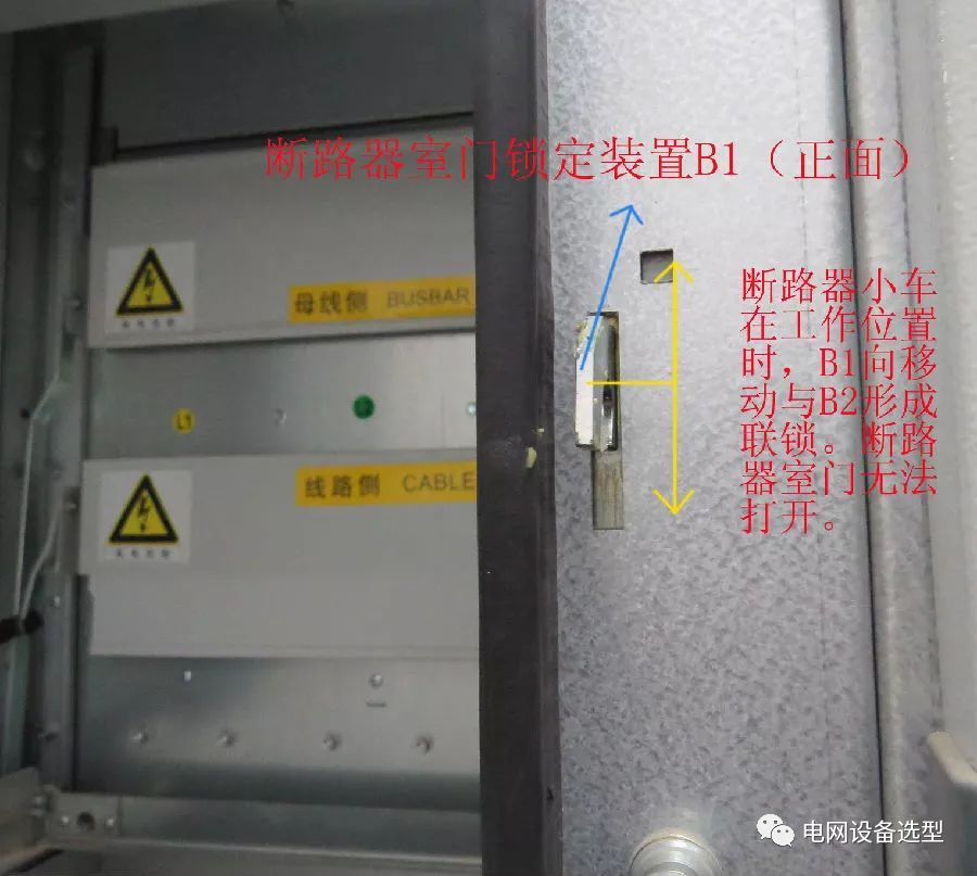闭锁2.手车在运行位置或中心位置时,断路器室门无法翻开。如下图所示,手车位置联动断路器室门锁定装置B1,当手车在事情位置或中心位置时,锁定装置B1与断路器室门锁定装置B2相扣,断路器时门无法翻开。
