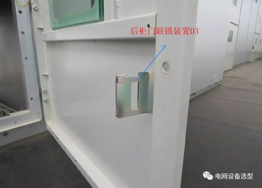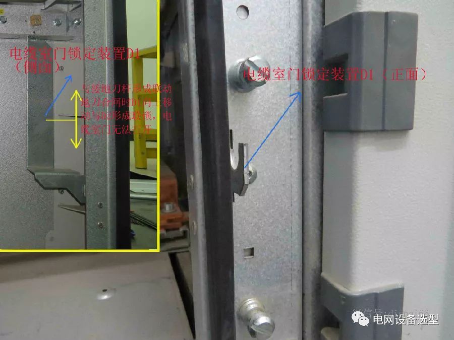 闭锁4:接地刀闸分闸时,电缆室门和柜后门无法翻开。如图所示,接地分闸时,电缆室门锁定装置D1向下移动与电缆室门板上D2相扣,致使电缆室门无法翻开。后柜门原理与此相似,使D3与D4相互联锁,不可翻开后柜门。接地刀闸合闸之后,柜门才华翻开。