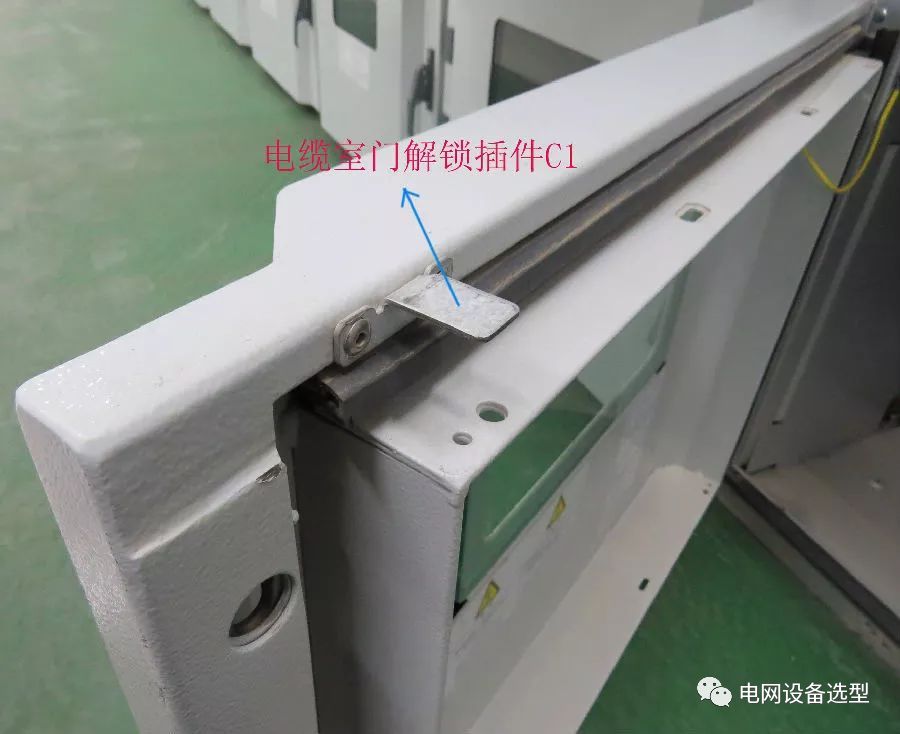 闭锁3.电缆室门翻开时,接地开无法操作。如下图所示。当电缆室门解锁插件C1,插入插槽C2时,接地开关锁定销C3向左缩进隐藏,接地操作杆才华插入地刀操作孔,允许操作。
