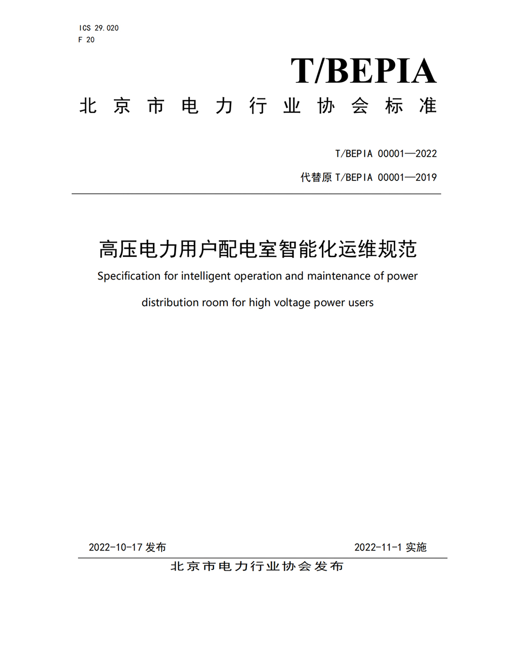 2022年10月17日,北京市电力行业协会宣布《高压电力用户配电室智能化运维规范》(T/BEPIA 00001—2022)整体标准。本次2022年团标的宣布,是在2019年宣布的《高压电力用户配电室智能化运维规范》的基础上,连系智能运维配电室树模试点工程的履历、行业手艺的更新和北京市地方标准《配电室清静治理规范》(DB11/T 527-2021)举行的升级完善。